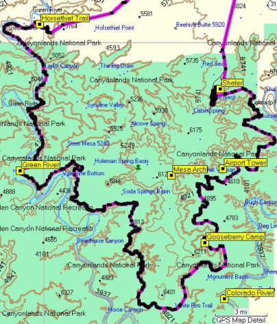 This was our big off-road trip. It's a loop that's almost 100 miles long. The Colorado and Green Rivers come together to make a "Y" with the White Rim being in the upper section. The road first follows the Colorado River to the confluence, then back up along the Green River. The majority of the rim (and the road) is at the same elevation - a mid level between the paved roads at the top level and the rivers at the bottom.