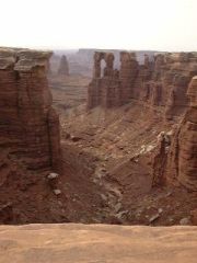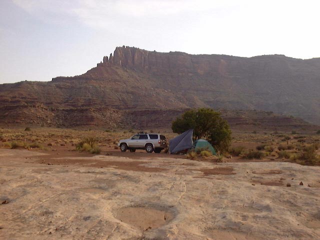 Once we got a few miles from the bottom of Shafer Trail, we were pretty much alone. And once we got to camp, we were very alone. But on the way, we stopped at an overlook of the Colorado River. And every turn had a different, incredible view, with steep cliffs heading up, deep canyon heading down, and cool formations in the distance. The road would come within a few feet of the rim edge (many pictures were taken from the car).